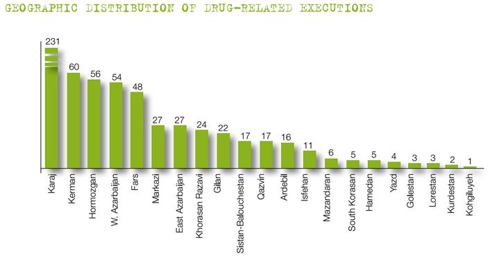 The prisons which carried out the most drug related executions in 2015 were Ghezel Hesar and Rajai Shahr prisons, both located in the Tehran/Karaj area. Kerman (southeastern Iran), Hormozgan (southern border) and Urmia (northwestern border) also had a high number of drug related executions. Most of the executions were not announced by official Iranian media.