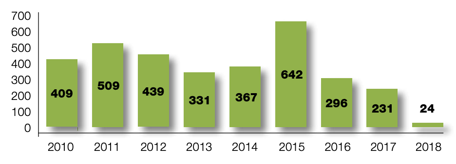 According to IHR reports, at least 3,248 people were executed for drug offences between 2010 and 2018. This gives an average of 361 drug-related executions per year. The diagram above shows that the number of drug-related executions has been under the “average” in the last three years.