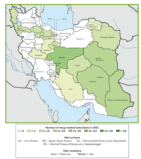 In 2021, IHRNGO reported drug-related executions in 15 provinces, compared to 12 provinces in 2019 and 2020 and 7 provinces in 2018.