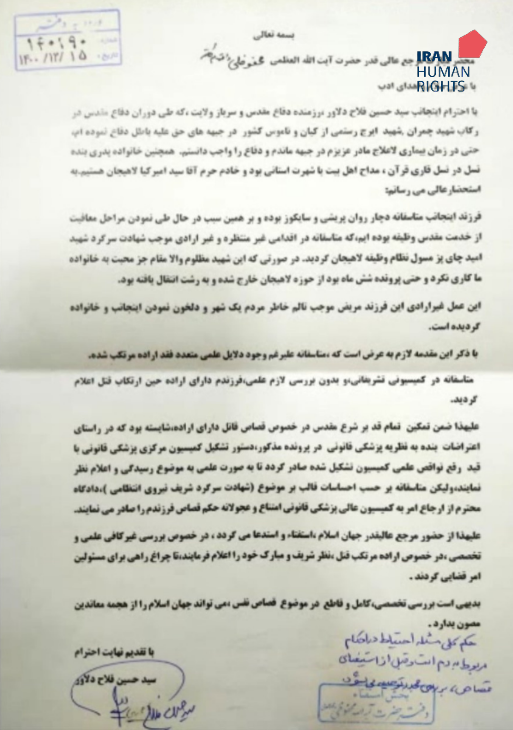 A letter sent by Morteza's family: