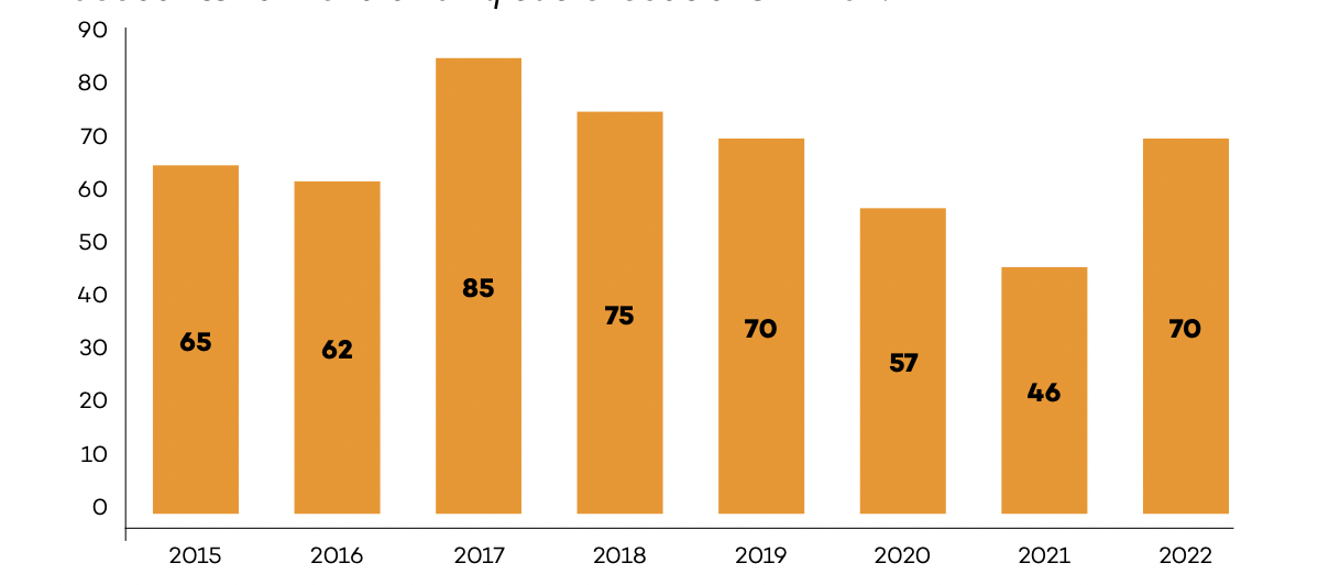 The number of qisas executions, which was relatively low between 2010 and 2012, increased dramatically in 2013 and has remained at a high level since. This coincides with growing international criticism of Iran’s drug-related executions. In 2022, at least 288 people were subjected to qisas executions.
