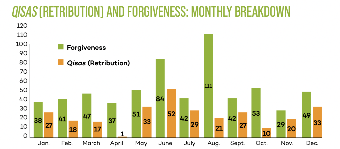 The diagram above shows the monthly breakdown of implemented qisas death sentences compared to forgiveness cases. Forgiveness cases outnumber those of qisas executions throughout the year.