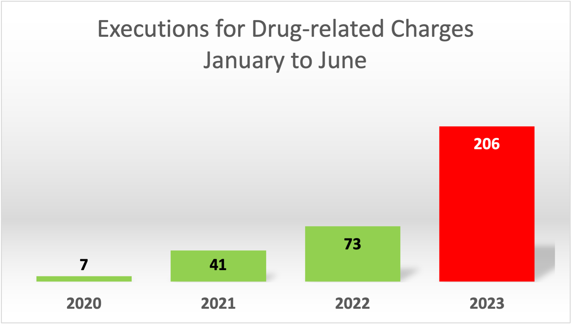 Drug-related executions have continuously risen every year for the past three years. 206 people were executed for drug-related charges in the first six months of 2023, a 126% rise compared to the same period in 2022 when 91 were executed. 40 people were executed in the same period in 2021.
