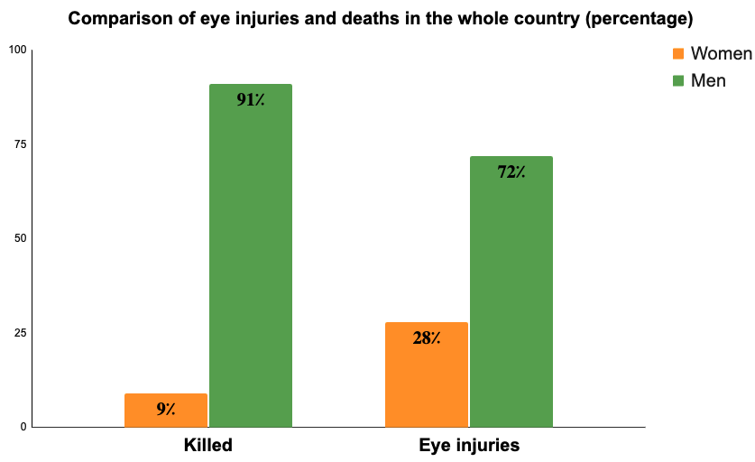 While women constituted 9% of protester death numbers, they make up 28% of eye injury numbers. Of the at least 551 protester deaths verified by IHRNGO, 49 were women and 502 were men. However, of the 138 recorded eye injuries, 38 were women and 100 were men.