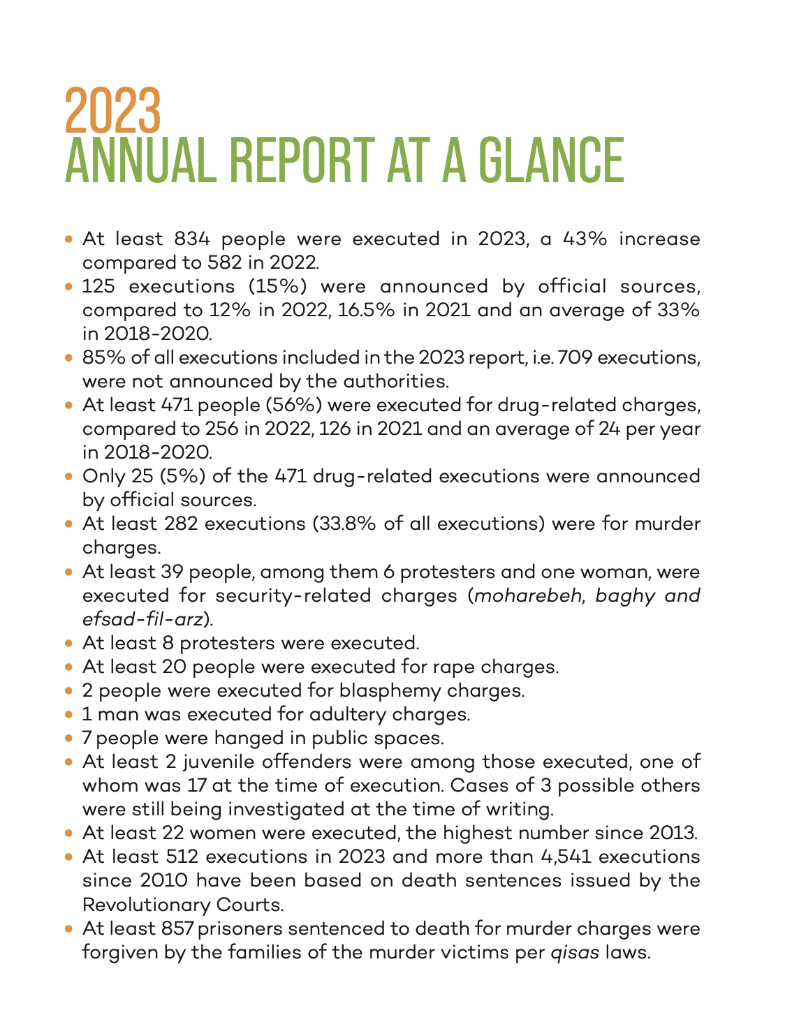 Eight protesters were executed in 2023, six of whom were arrested in relation to the “Woman, Life, Freedom” protests and sentenced to death in grossly unfair trials without due process. While executions of the protesters led to strong international reactions in the beginning of the year, the executions in the second half of the year failed to elicit the same level of condemnation and backlash. The correlation between lack of international attention and the use of the death penalty by the Islamic Republic was especially evident after the onset of the war in Gaza on 7 October 2023. The average number of daily executions rose from two people before the onset of the war in Gaza to an average of 3-4 executions per day during the war.