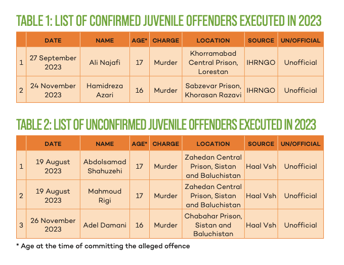 In November 2023, the UNGA expressed “serious concern at the continued imposition of the death penalty by the Islamic Republic of Iran against minors, and urges the Islamic Republic of Iran to cease the imposition of the death penalty against minors, including persons who were under the age of 18, at the time of their offence, in violation of the ICCPR and to commute the sentences for child offenders on death row.”[9]
