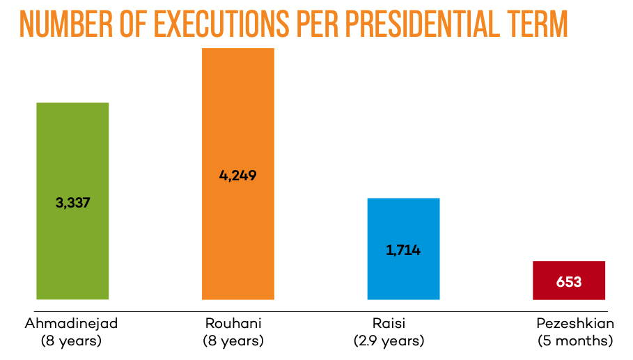 At least 653 people have been executed since Masoud Pezeshkian took office in July 2024. For comparison, during the less than three years of Ebrahim Raisi’s presidency (2021–2024), and the two terms (8 years each) of Presidents Hassan Rouhani (2013–2021) and Mahmoud Ahmadinejad (2005–2013), at least 1,714, 4,249, and 3,337 people were executed, respectively.