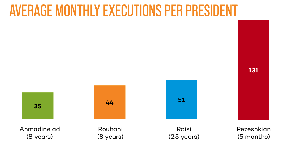 Average monthly executions: A comparison of executions during Pezeshkian’s five months in office with those under the previous three presidents –Ahmadinejad, Rouhani, and Raisi – reveals a consistent upward trend in the Islamic Republic’s use of the death penalty, regardless of the president in power. However, the increase during the first five months of Pezeshkian’s presidency has been particularly dramatic. The average number of monthly executions under Pezeshkian has reached 130 (more than four executions per day), compared to 51 per month during Raisi’s tenure, 44 under Rouhani, and 35 under Ahmadinejad. Over the course of all these presidential terms, Iran has maintained a daily execution rate of at least one person.