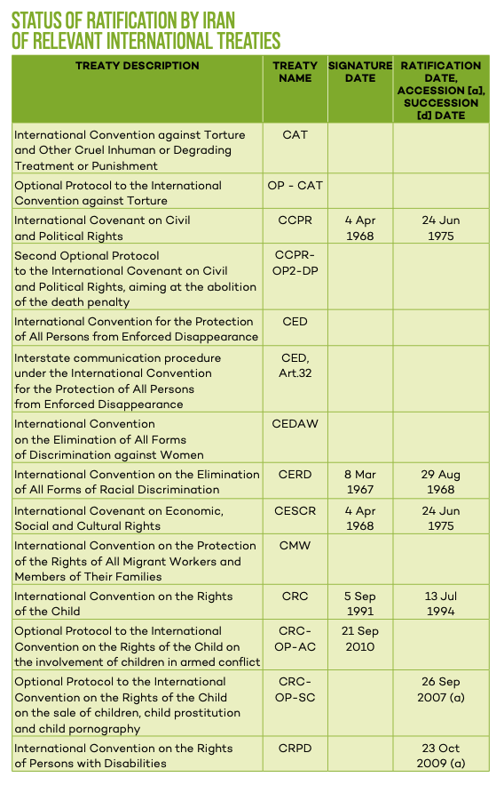 The Islamic Republic of Iran has ratified three international human rights treaties that apply to the death penalty: the International Covenant on Civil and Political Rights (ICCPR) in 1975, the International Convention on the Rights of the Child (CRC) in 1994, and the Convention on the Rights of Persons with Disabilities (CRPD) in 2009.