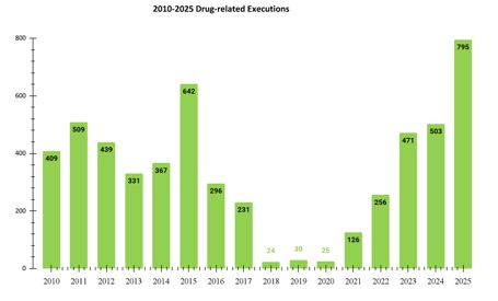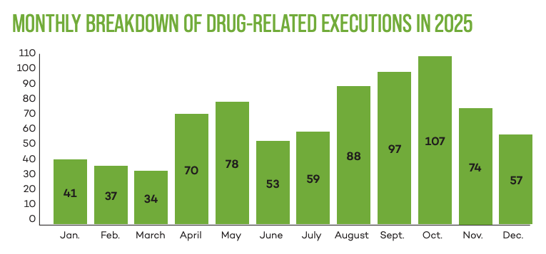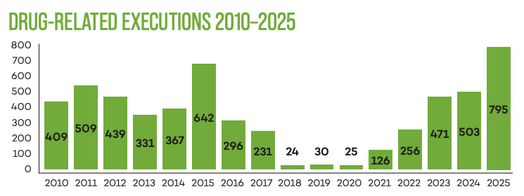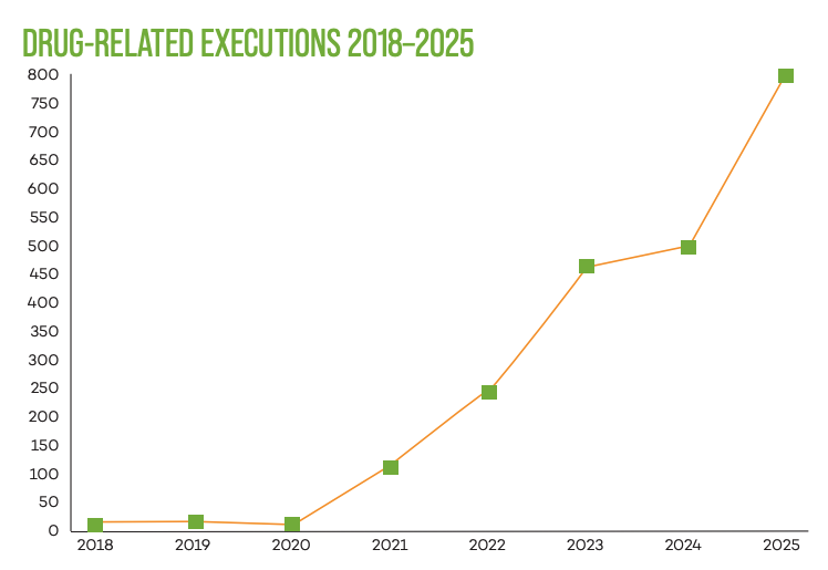 Drug-related executions increased dramatically after 2020. The number of drug-related executions in 2023 and 2024 was respectively 18 and 19 times higher than the annual average recorded between 2018 and 2020. This dramatic rise continued in 2025, with a further increase of 58% compared to 2024.
