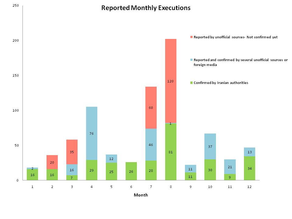 Diagram showing monthly distribution of the reported executions in 2010. The values in the red part of the coloumns indicate minimum of the reported executions not included in the annual report due to inaccuracy in number and time of the executions. Most of the executions, in particular the mass-executions of Mashhad took place in the months of April, July and August.