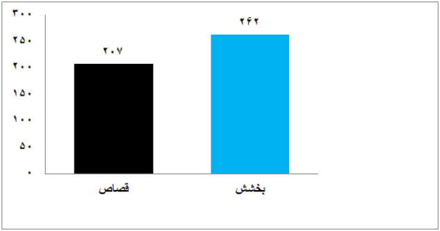 • نمودار بالا موارد قصاص‌های اجرا شده (سیاه) و مواردی که بخشش (آبی) صورت گرفته است را نمایش می‌دهد. تعداد بخشش‌ها ۲۶ درصد بیشتر از اجرای اعدام‌ها بوده است.