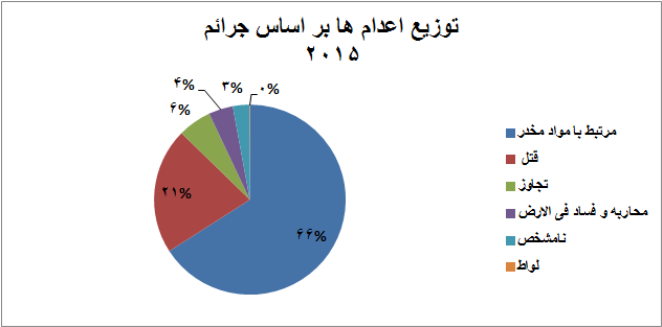 در سال ۲۰۱۵ اکثریت اعدام‌ها برای جرائم مرتبط با مواد مخدر بوده است. مانند ۳ سال گذشته قتل عمد دومین رتبه در اجرای مجازات اعدام به خود اختصاص داده است.