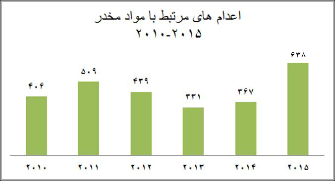 حقوق بشر ایران، ۲۴ اسفند ماه ۱۳۹۴: ۶۳۸ نفر از ۹۶۹ اعدام در سال ۲۰۱۵ را زندانیانی تشکیل میدادند که با جرایم مربوط به موادمخدر به اعدام محکوم شده بودند که اکثر این افراد به گروههای حاشیه نشین، بخصوص مناطق اتنیکی مثل بلوچستان تعلق داشتند. از زندانهای کرج به ویژه زندان قزلحصار بیشترین میزان اعدامهای مرتبط با موادمخدر گزارش شده است. کرمان، هرمزگان و آذربایجان غربی (زندان ارومیه) از جمله استانهایی هستند که تعداد اعدامهای بالایی در این زمینه داشتهاند. آمارهای شش ساله گذشته (از ۲۰۱۰ تا ۲۰۱۵) نشان میدهند که بیش از ۲۶۹۰ نفر در این ارتباط در ایران اعدام شدهاند.