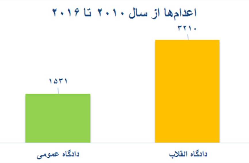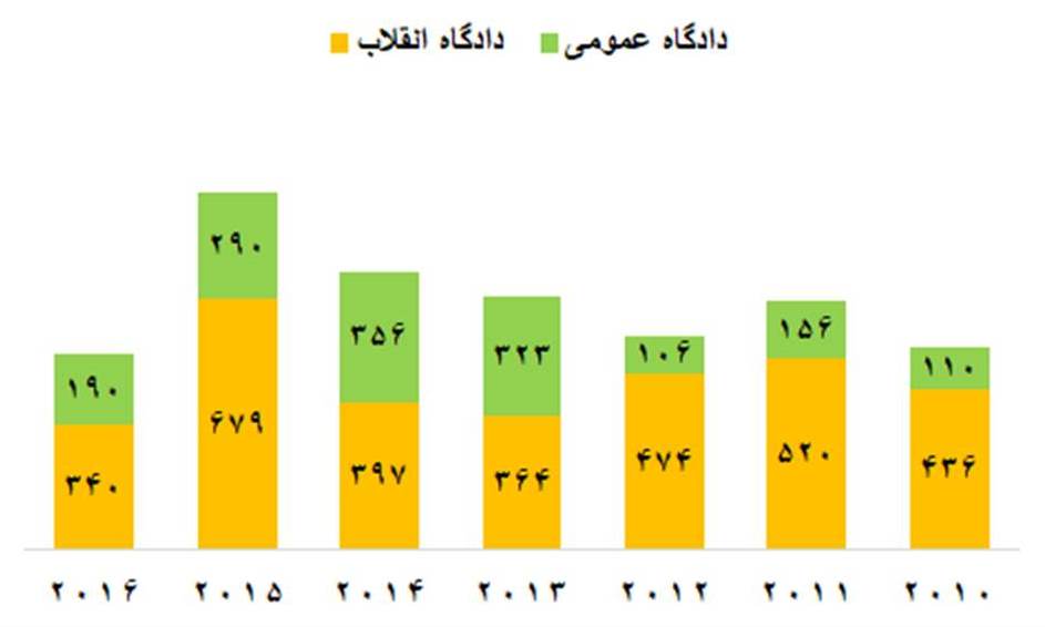 دستکم ۳۴۰ اعدام از ۵۳۰ اعدام در سال ۲۰۱۶ (۶۴%) بر اساس احکام صادره از دادگاههای انقلاب اجرا شده است. نمودار بالا مربوط به اعدامهای ۶ سال گذشته بر اساس نوع دادگاه است.