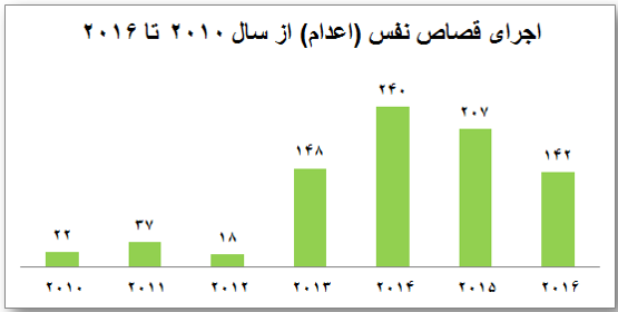 سازمان حقوق بشر ایران در نهمین گزارش سالانه خود آمار اعدامها در سال ۲۰۱۶ را اعلام کرده است. طبق این گزارش در این سال دستکم ۵۳۰ نفر اعدام شدهاند که از این میان دستکم ۱۴۲ نفر با اتهام قتل عمد به قصاص نفس (اعدام) محکوم شده بودند.