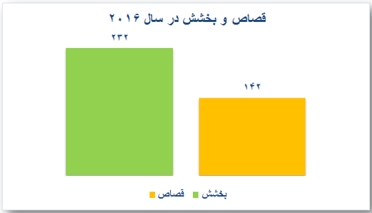 با توجه به گزارشهای سازمان حقوق بشر ایران نمودار بالا تعداد بخششها و اعدامهای مربوط به قصاص در سال ۲۰۱۶ را نشان میدهد. تعداد بخششها ۶۳ درصد بیشتر از تعداد قصاصها بوده است.