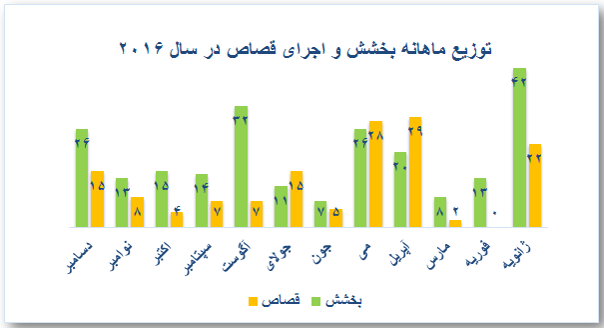 نمودار بالا تفکیک ماهانه اجرای قصاص و بخششها را نشان میدهد. در ۹ ماه از سال تعداد بخششها از اجرای قصاص در سال ۲۰۱۶ بیشتر بوده است.