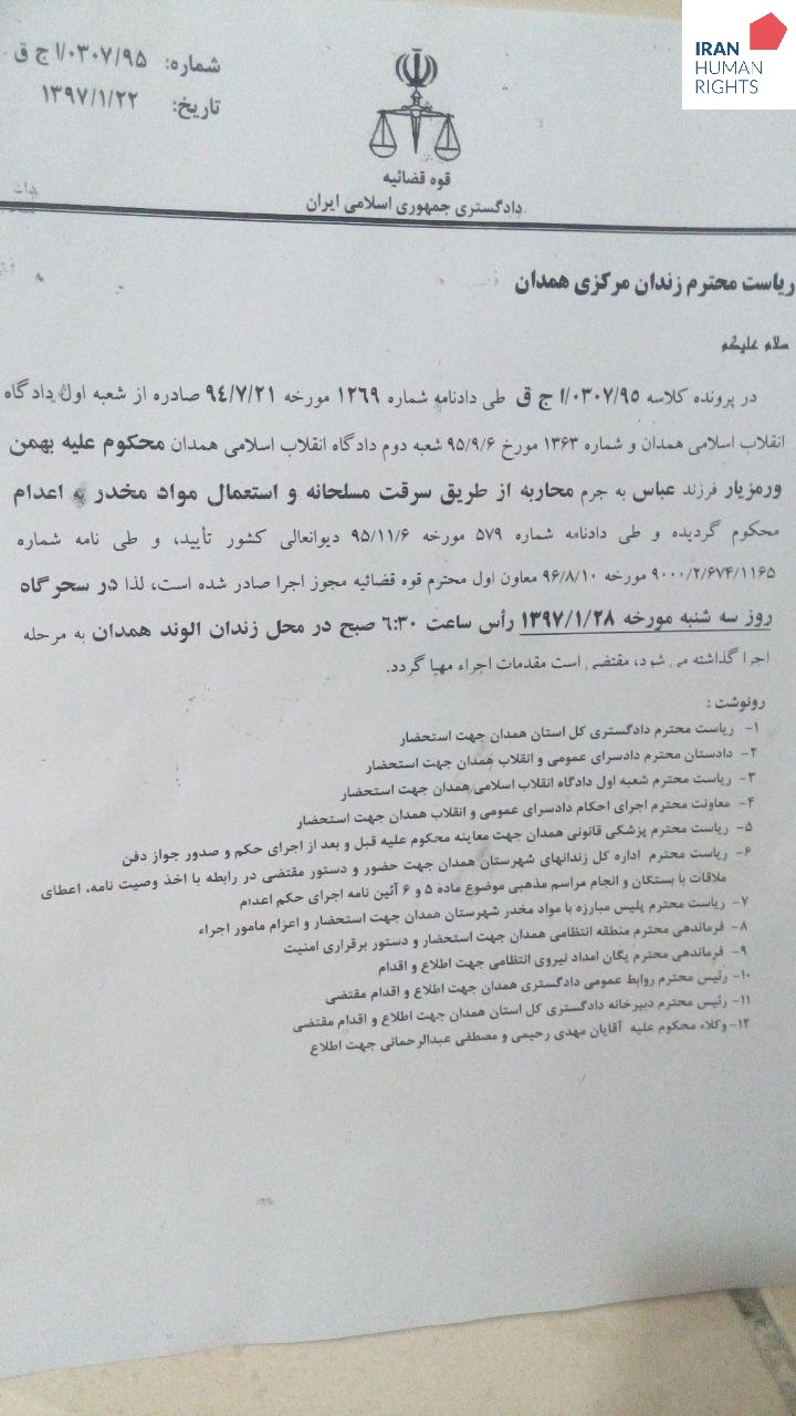 بنا به اطلاع سازمان حقوق بشر ایران، ساعت ۱۰ صبح روز جمعه ۲۴ فروردین ماه دو زندانی به نامهای بهمن ورمزیار و مهدی چراغی جهت اجرای حکم اعدام به سلول انفرادی (قرنطینه) منتقل شدند. این دو زندانی به اتهام محاربه از طریق سرقت مسلحانه به اعدام محکوم شدهاند.
