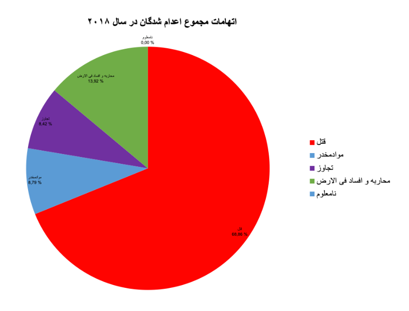 نمودار بالا نشان دهنده اتهامهایی است که بر اساس آنها احکام اعدامهای اجرا شده در سال ۲۰۱۸ صادر شده است. برای دومین بار طی هشت سال گذشته ردیف اعدامها با اتهام قتل عمد، اکثریت اعدامها در سال ۲۰۱۸ را تشکیل داده است.