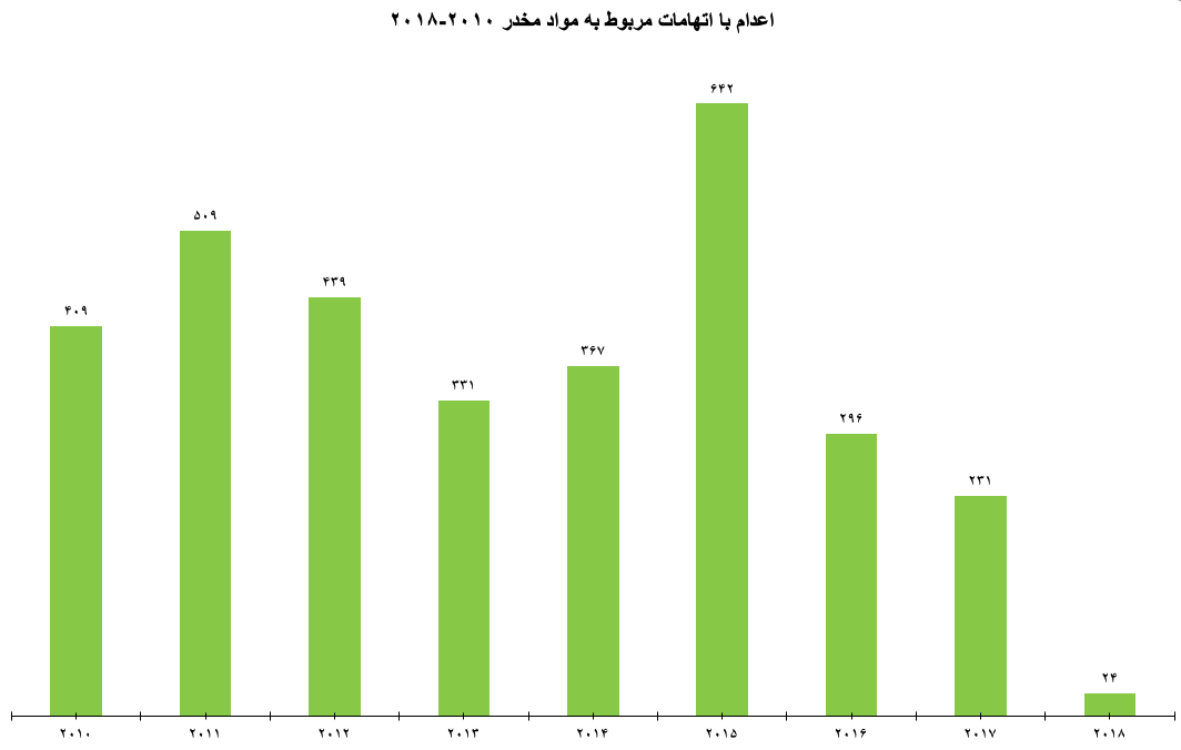 طبق گزارش‌های سازمان حقوق بشر ایران، بین سال ۲۰۱۰ تا ۲۰۱۸ دست‌کم ۳۲۴۸ نفر برای جرایم مربوط به مواد مخدر در ایران اعدام شدند. یعنی به‌طور متوسط ۳۶۱ اعدام مربوط به مواد مخدر در هر سال اجرا شده‌اند. نمودار بالا نشان می‌دهد که تعداد اعدام‌های مربوط به مواد مخدر در سه سال گذشته از این میانگین کمتر بوده است.