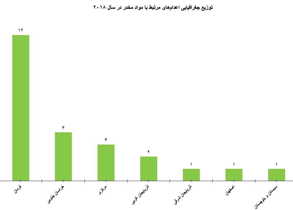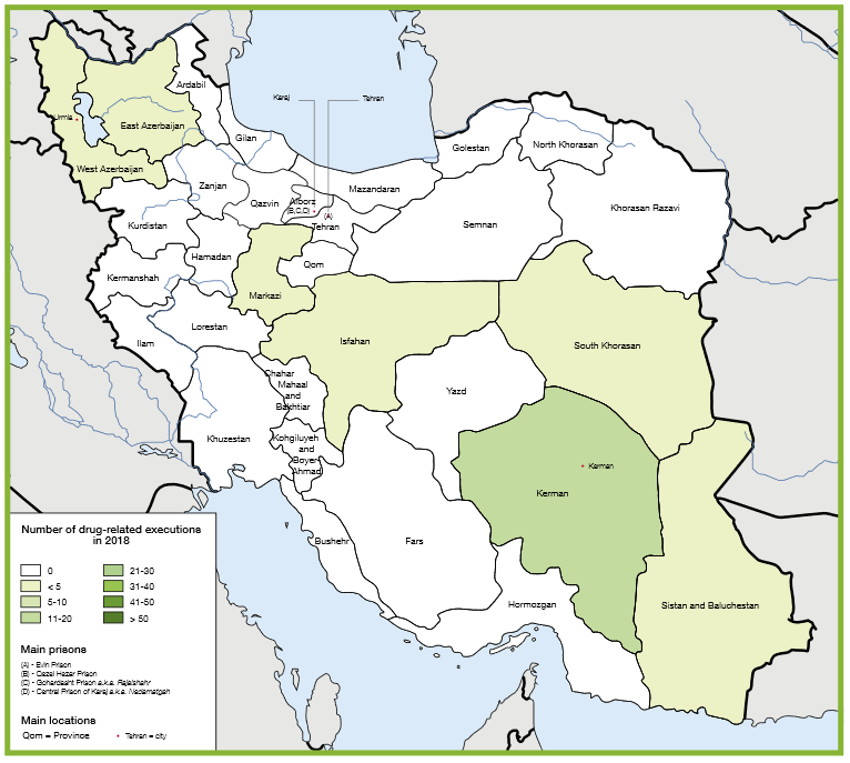 در سال ۲۰۱۸ اعدام‌های مرتبط با مواد مخدر در هفت زندان مختلف به اجرا درآمد. گزارش‌های بیشتری در خصوص اعدام دو زندانی در کرمانشاه (غرب ایران) دریافت شد، اما این گزارش‌ها توسط منابع مستقل تایید نشدند و بنابراین، در گزارش فعلی موجود نیستند.