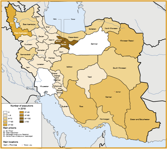 زندان‌های کرج که در آن زندانیانی از استان های تهران و البرز نگهداری می‌شوند و پس از آن زندان‌های استان آذربایجان غربی، خراسان رضوی، سیستان و بلوچستان و کرمان مکان‌هایی بودند که در سال ۲۰۱۸ بیشترین احکام اعدام در آن‌جا به اجرا درآمده است.