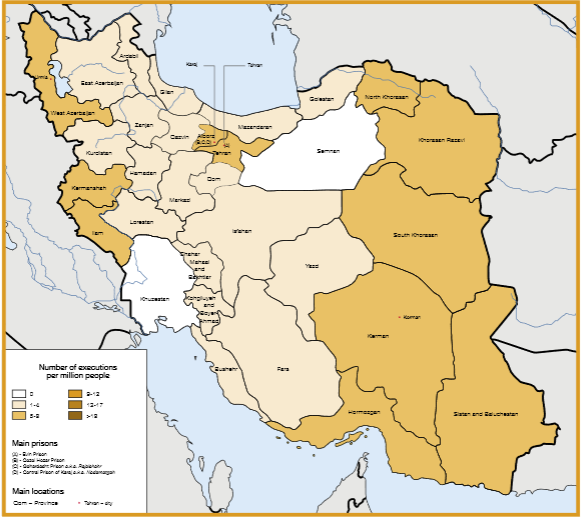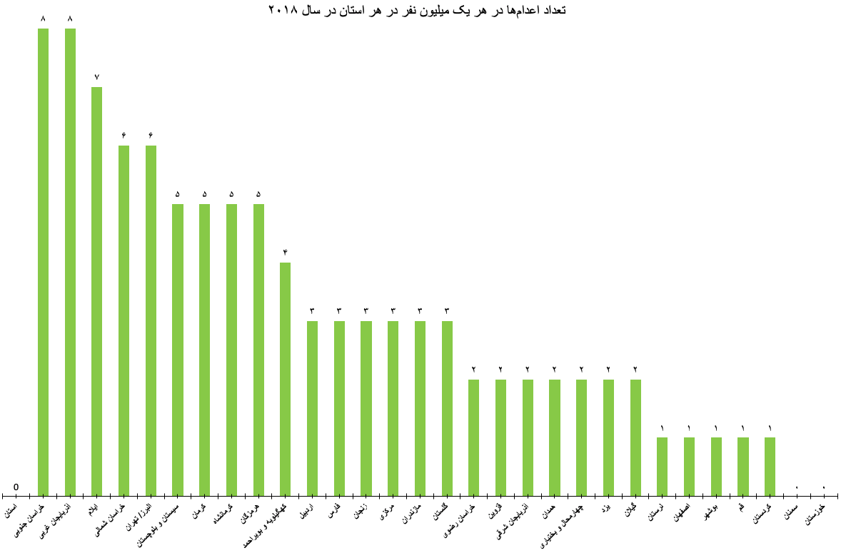 در سال ۲۰۱۸ از هر یک میلیون نفر ۳.۴ نفر در ایران اعدام شدند. استان‌های خراسان جنوبی و آذربایجان غربی که در آن‌ها از هر یک میلیون نفر ۸ نفر اعدام شدند بالاترین میزان اعدام به نسبت سرانه جمعیت را داشتند. اعداد کامل در جدول شماره ۳ در ذیل گزارش موجود است