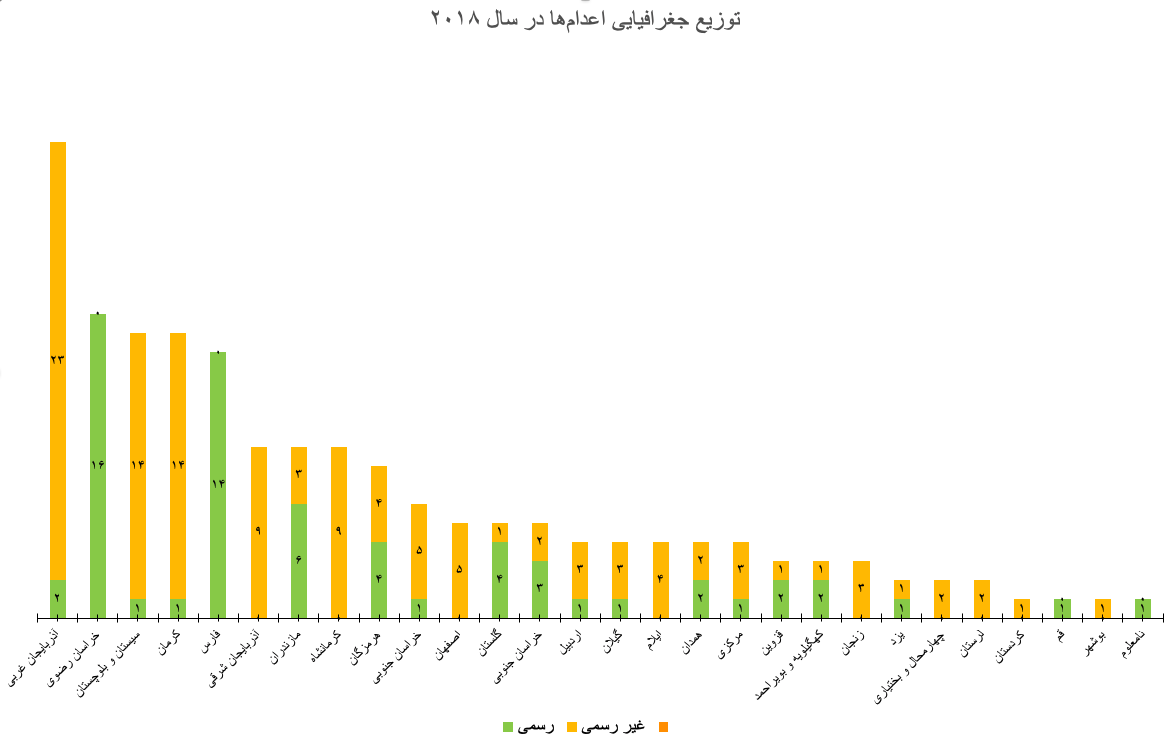 نمودار بالا نشان دهنده توزیع جغرافیایی اعدام‌های رسمی (سبز) و غیر رسمی/ اعلام نشده (زرد) در سایر نقاط ایران به استثنای منطقه تهران/ کرج است. زندان های استان آذربایجان غربی (شمال غرب)، خراسان رضوی (شمال شرقی)، سیستان و بلوچستان (جنوب شرقی) و کرمان بیشترین تعداد اعدام ها را بعد از تهران/ کرج به خود اختصاص داده‌اند. آذربایجان غربی،‌سیستان و بلوچستان و کرمان بالاترین میزان اعدام‌های اعلام‌نشده را داشتند.