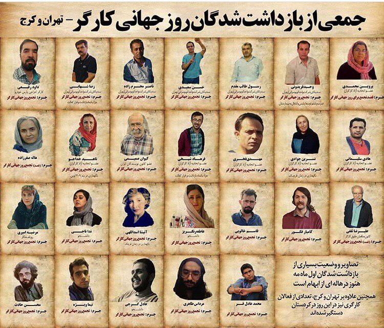 بر اساس تازه‌ترین گزارش‌ها از تهران، رضا شهابی از فعالان شناخته شده کارگری، کیوان صمیمی، حسن سعیدی، وحید فریدونی، محمدعلی اصلاغی، سیدرسول طالب مقدم، اسدالله سلیمانی، و ناصر محرم‌زاده از جمله بازداشت شدگان هستند. شمار بازداشتیان به بیش از ۵۰ نفر میرسد.
