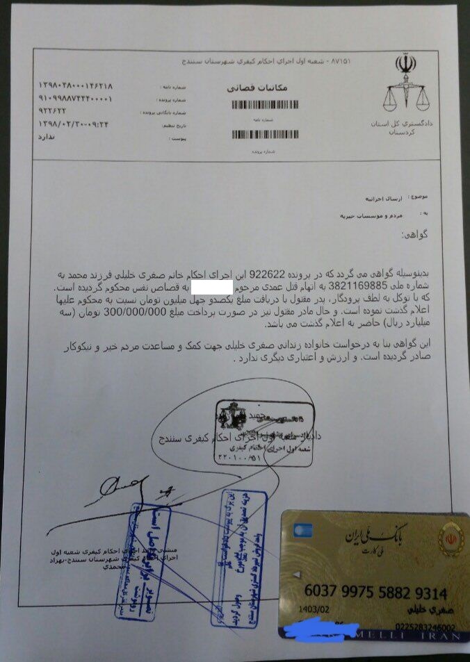 سازمان حقوق بشر ایران، ۳ تیر ماه ۱۳۹۸: یک زن در زندان مرکزی سنندج به نام صغری خلیلی که به اتهام «قتل عمد» به قصاص نفس (اعدام) محکوم شده، برای نجات به یاری خیران نیازمند است.