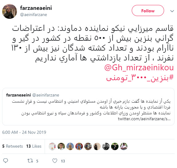 فرزانه آئینی، خبرنگار پارلمانی روز ۳ آذر ماه در توئیتر خود به نقل از قاسم ميرزایی نيكو، نماينده دماوند در مجلس شورای اسلامی، نوشت: «اعتراض‌های اخیر در بیش از ۵۰۰ نقطه کشور رخ داده و بیش از ۱۳۰ نفر در جریان اعتراضات کشته شده‌اند».