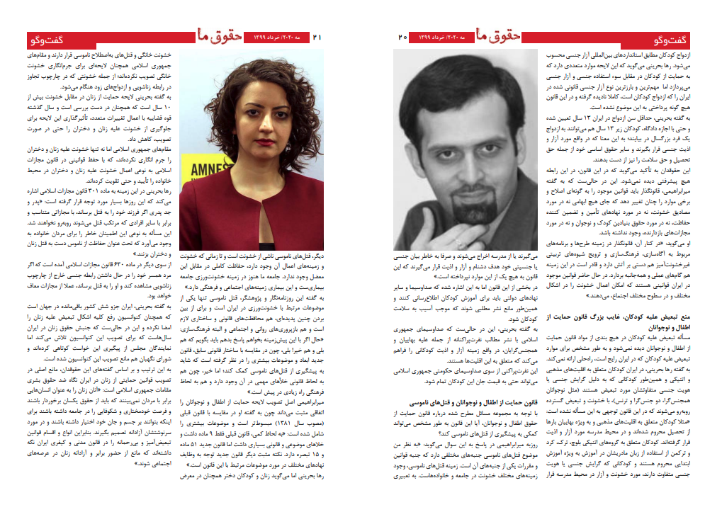 او میگوید: «در کنار آن، قانونگذار در زمینه طرحها و برنامههای مربوط به آگاهسازی، فرهنگسازی و ترویج شیوههای تربیتی غیرخشونتآمیز هم دستی بر آتش دارد و قادر است در این زمینه هم گامهای عملی و همهجانبه بردارد. در حال حاضر قوانین موجود در ایران قوانینی هستند که امکان اعمال خشونت را در اشکال مختلف و در سطوح مختلف اجتماع، میدهند.»