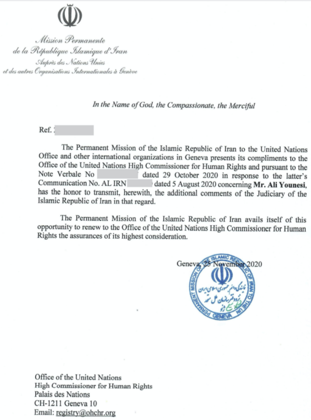 نماینده جمهوری اسلامی ایران در دفتر سازمان ملل متحد در ژنو اما حدود سه ماه بعد یعنی در تاریخ ۲۹ اکتبر ۲۰۲۰/ هشتم آبان ۱۳۹۹، در پاسخ به نامه یاد شده، با ادعاهای غیر واقعی، در صدد لاپوشانی حقیقت و قلب واقعیت درباره وضعیت علی یونسی برآمده است.