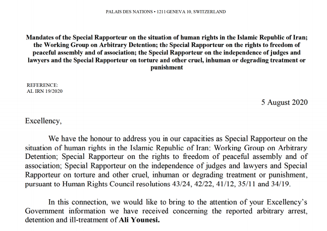 جمعی از کارشناسان مستقل حقوق بشر در سازمان ملل متحد اما روز پنجم اوت ۲۰۲۰/ ۱۵ مردادماه ۱۳۹۹، با ارسال نامهای (که یک نسخه از آن در اختیار سازمان حقوق بشر ایران قرار گرفته) به نماینده جمهوری اسلامی ایران در سازمان ملل، خواستار دسترسی علی یونسی به حقوق قانونی خود و مصون ماندن او از بدرفتاری و شکنجه شدند.