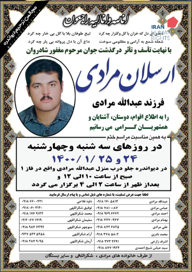 سازمان حقوق بشر ایران، ۲۴ فروردین ۱۴۰۰: حکم یک زندانی به‌نام ارسلان مرادی که با اتهامات مربوط به «مواد مخدر» به اعدام محکوم شده بود در زندان مرکزی بیرجند به اجرا درآمد.