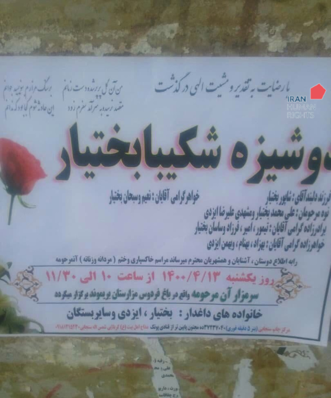 بنا به اطلاع سازمان حقوق بشر ایران، روز یک‌شنبه ۱۳ تیر ماه، یک دختر ۱۶ ساله به‌نام شکیبا بختیار توسط پدر خود به قتل رسید. به گفته منابع مطلع این قتل به وسیله ضربات متعدد چاقو انجام شده است.