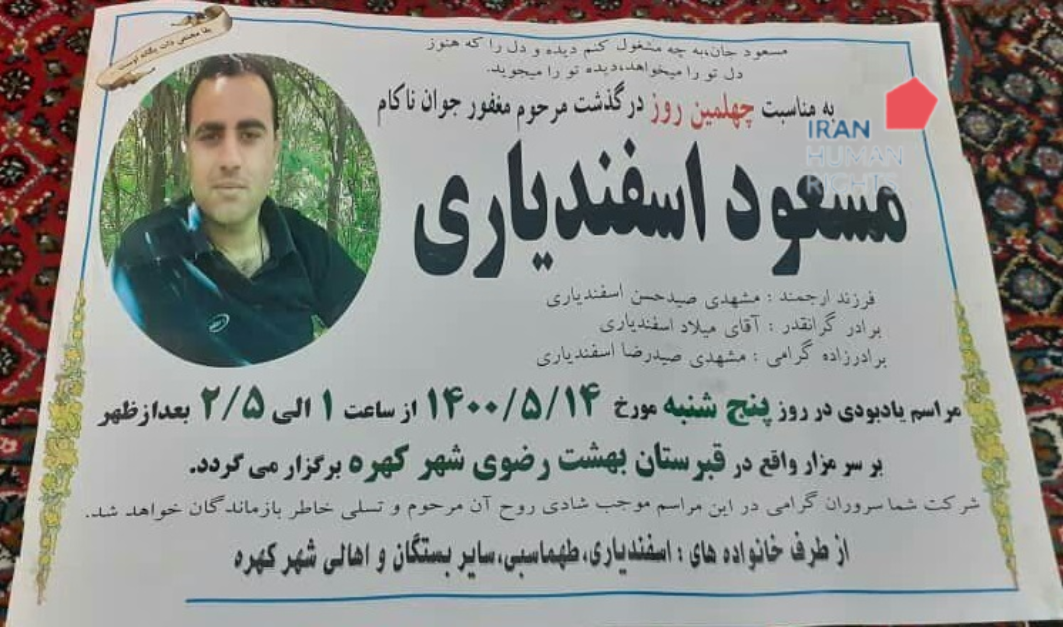 یک منبع مطلع در این خصوص به سازمان حقوق بشر ایران گفت: «مسعود اسفندیاری حدود ۱۳ سال قبل، نامزد خود را که دختر عمویش هم بود، به قتل رسانده بود. خانواده مقتول تا آخرین لحظه حاضر به رضایت نشدند، و حتی مجبور شدند، با توجه به نصف بودن دیه زن نسبت به مرد، مبلغ ۱۶۰ میلیون تومان نیز به عنوان تفاضل دیه، پرداخت کنند».