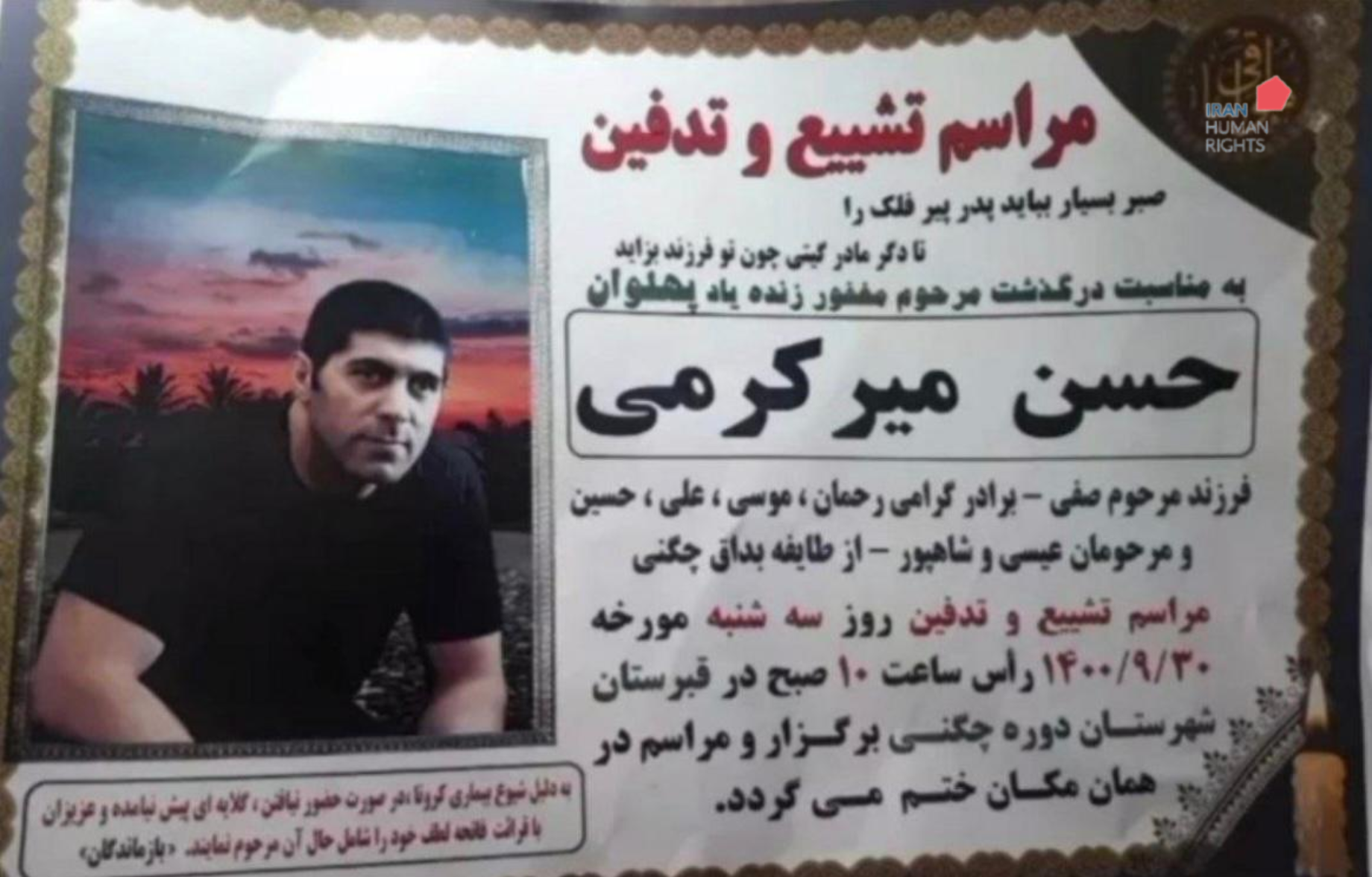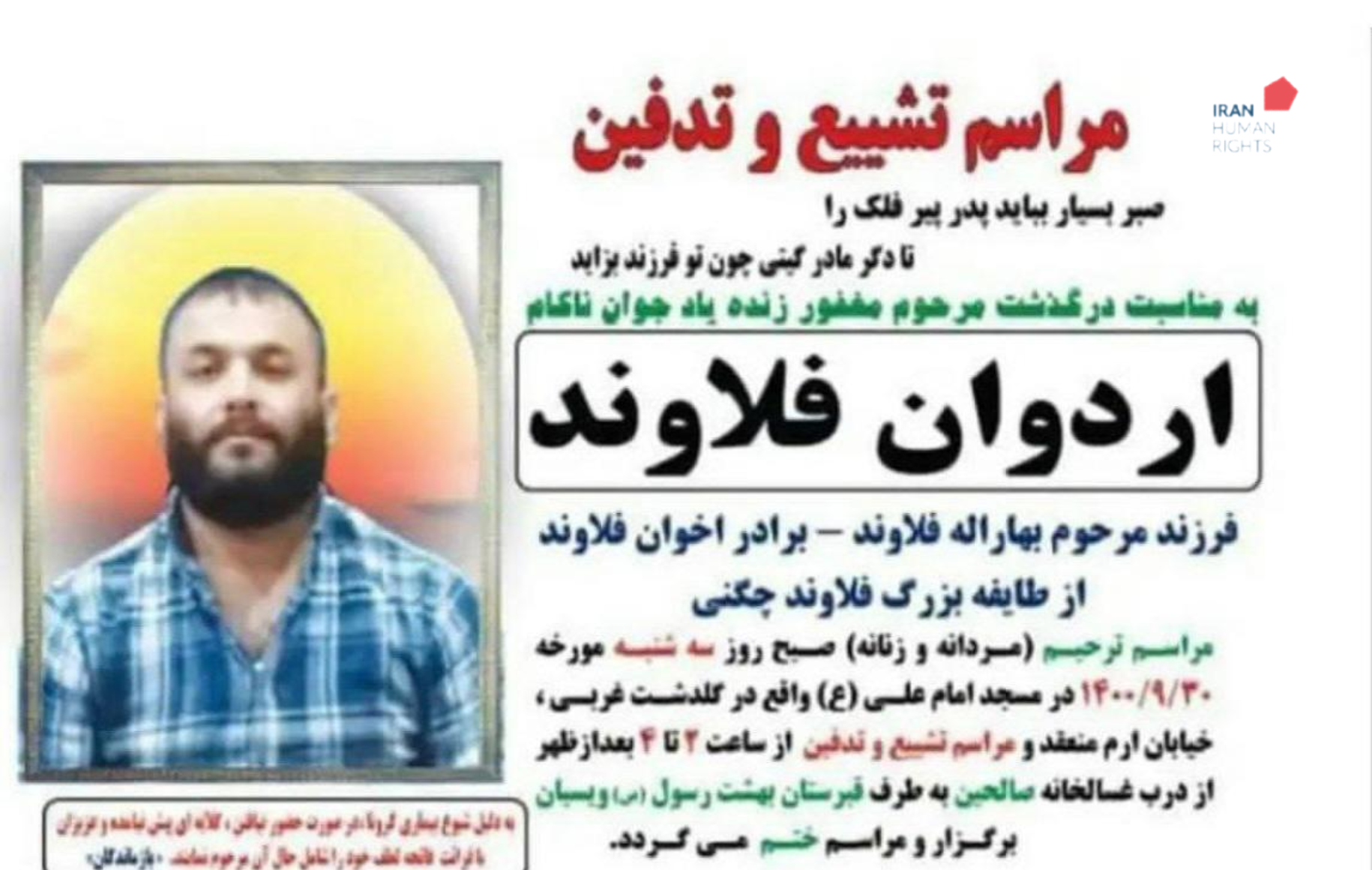 سازمان حقوق بشر ایران؛ یکشنبه ۴ دی ماه ۱۴۰۰: حکم دو زندانی به‌نام‌های اردوان فلاحوند و حسین میرکرمی که در یک پرونده با اتهام «محاربه و قتل عمد» به اعدام و قصاص نفس محکوم شده بودند در زندان مرکزی خرم آباد به اجرا درآمد.