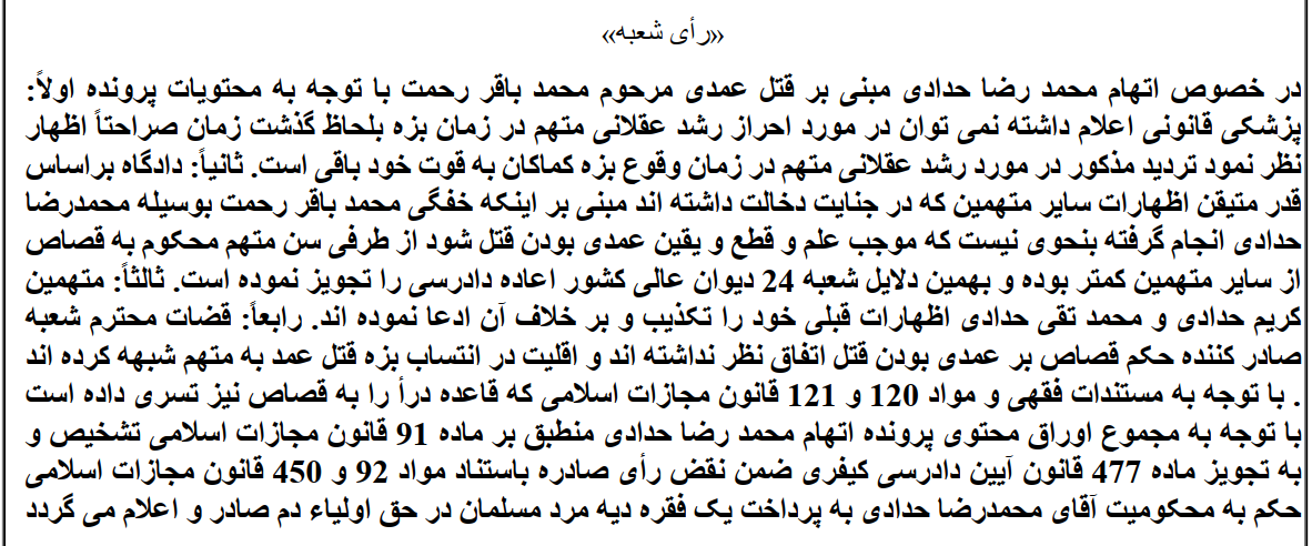 بنا به اطلاع سازمان حقوق بشر ایران، پس از ۱۹ سال زندان، حکم قصاص نفس محمدرضا حدادی، کودک-مجرم زندان مرکزی شیراز (عادل آباد) از سوی دیوان عالی کشور لغو شد.