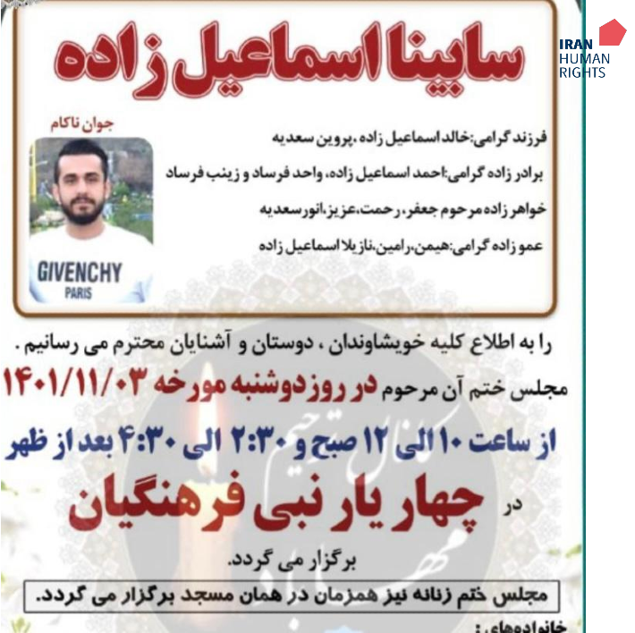 سازمان حقوق بشر ایران؛ ۳ بهمن ۱۴۰۱: حکم دست‌کم یک زندانی به‌نام سابینا اسماعیل‌زاده، که با اتهامات مربوط به «مواد مخدر» به اعدام محکوم شده بودند، در زندان مرکزی کرج (ندامتگاه) به اجرا درآمد.