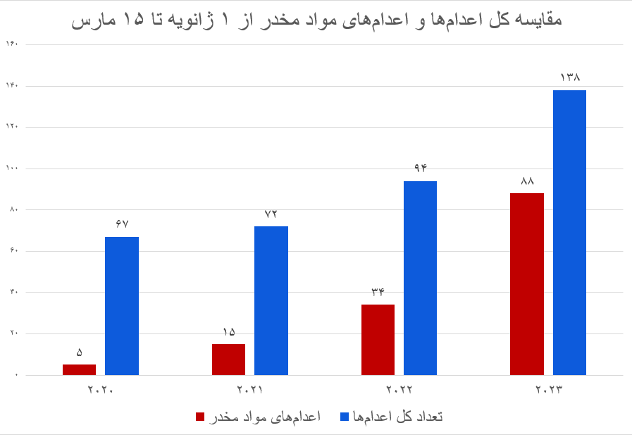 از ابتدای سال میلادی ۲۰۲۳ تا امروز، ۱۳۸ زندانی در ایران اعدام شدهاند که اتهام ۸۸ نفر از آنها مربوط به «مواد مخدر» بود.