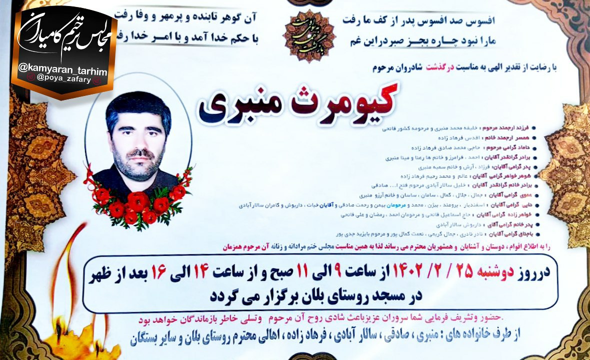 تصویر آگهی ترحیم کیومرث منبری که در شبکه‌های اجتماعی منتشر شده: