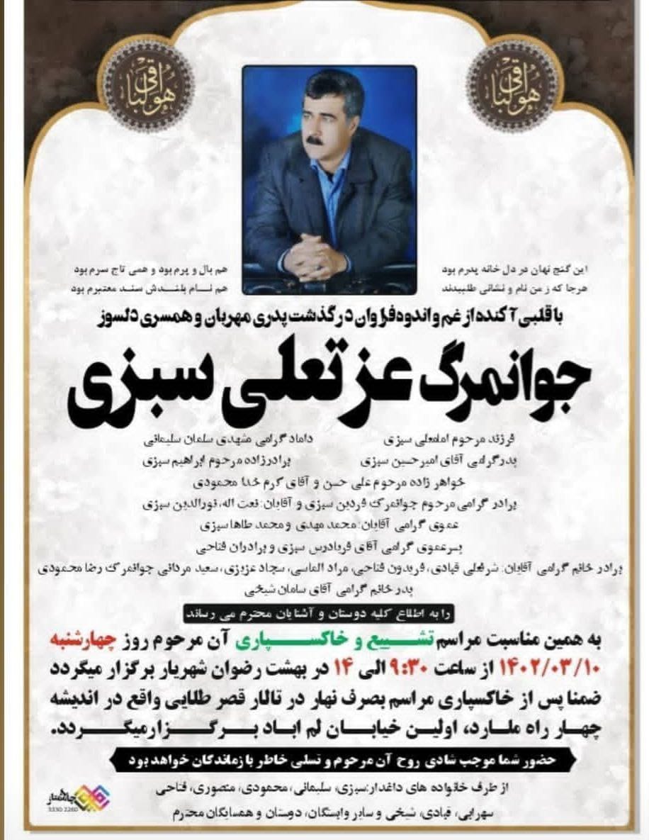 تصویر آگهی ترحیم عزتعلی سبزی که در اختیار سازمان حقوق بشر ایران قرار گرفته است: