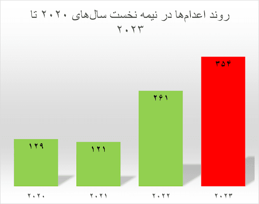 بنا بر گزارش سازمان حقوق بشر ایران، در شش ماه نخست سال ۲۰۲۳، دستکم ۳۵۴ در ایران اعدام شدند. این میزان اعدام، رشد شدیدی را نسبت به مدت مشابه سال قبل نشان میدهد. در شش ماه نخست سال ۲۰۲۲، ۲۶۱ نفر و در سال ۲۰۲۱، ۱۲۱ نفر اعدام شده بودند. بدین ترتیب، حکومت ایران در سال جاری میلادی ۳۶٪ بیشتر نسبت به مدت مشابه سال قبل، اعدام کرده است.