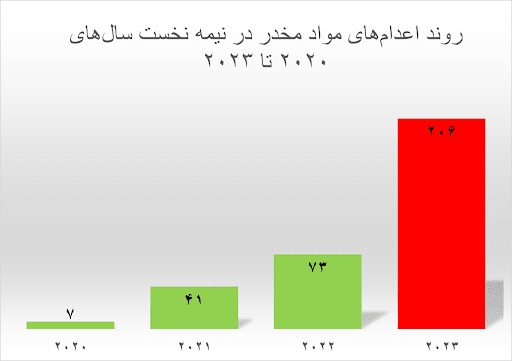 اعدام زندانیانی که با اتهامات مربوط به «مواد مخدر» اعدام شدهاند، در سه سال گذشته بهطور مستمر و هر ساله، افزایش شدیدی داشتهاند. امسال در مقایسه با شش ماه اول سال ۲۰۲۲ که ۹۱ نفر به اتهامهای مرتبط با مواد مخدر اعدام شده بودند، ۱۲۶٪ افزایش را شاهد بوده و ۲۰۶ اعدام با این اتهام به ثبت رسیده است. این آمار در مدت مشابه سال ۲۰۲۱، ۴۰ نفر بود.