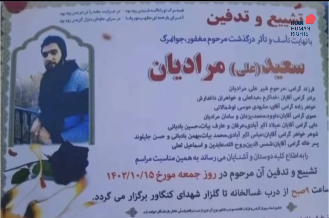 سازمان حقوق بشر ایران؛ ۱۵ دی ۱۴۰۲: حکم یک زندانی بهنام سعید مرادیان که با اتهامات مربوط به «مواد مخدر» به اعدام محکوم شده بود، در زندان مرکزی همدان به اجرا درآمد.