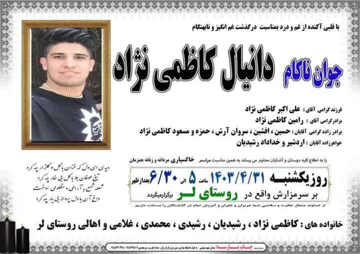 تصویر زیر آگهی ترحیم دانیال کاظمی‌نژاد است: