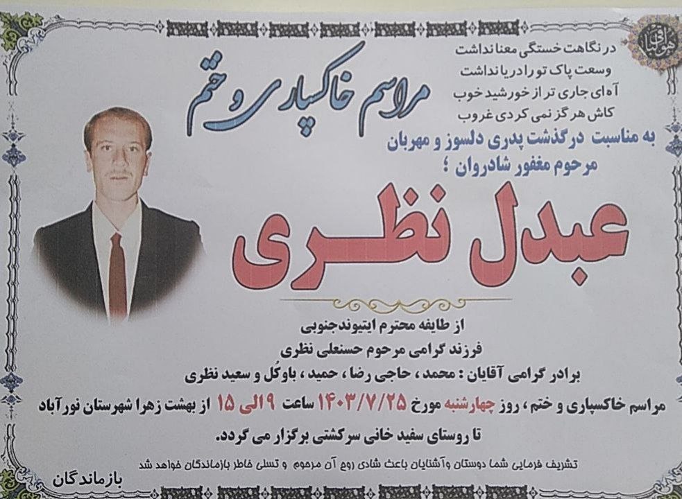 تصویر زیر آگهی ترحیم عبدل نظری است: