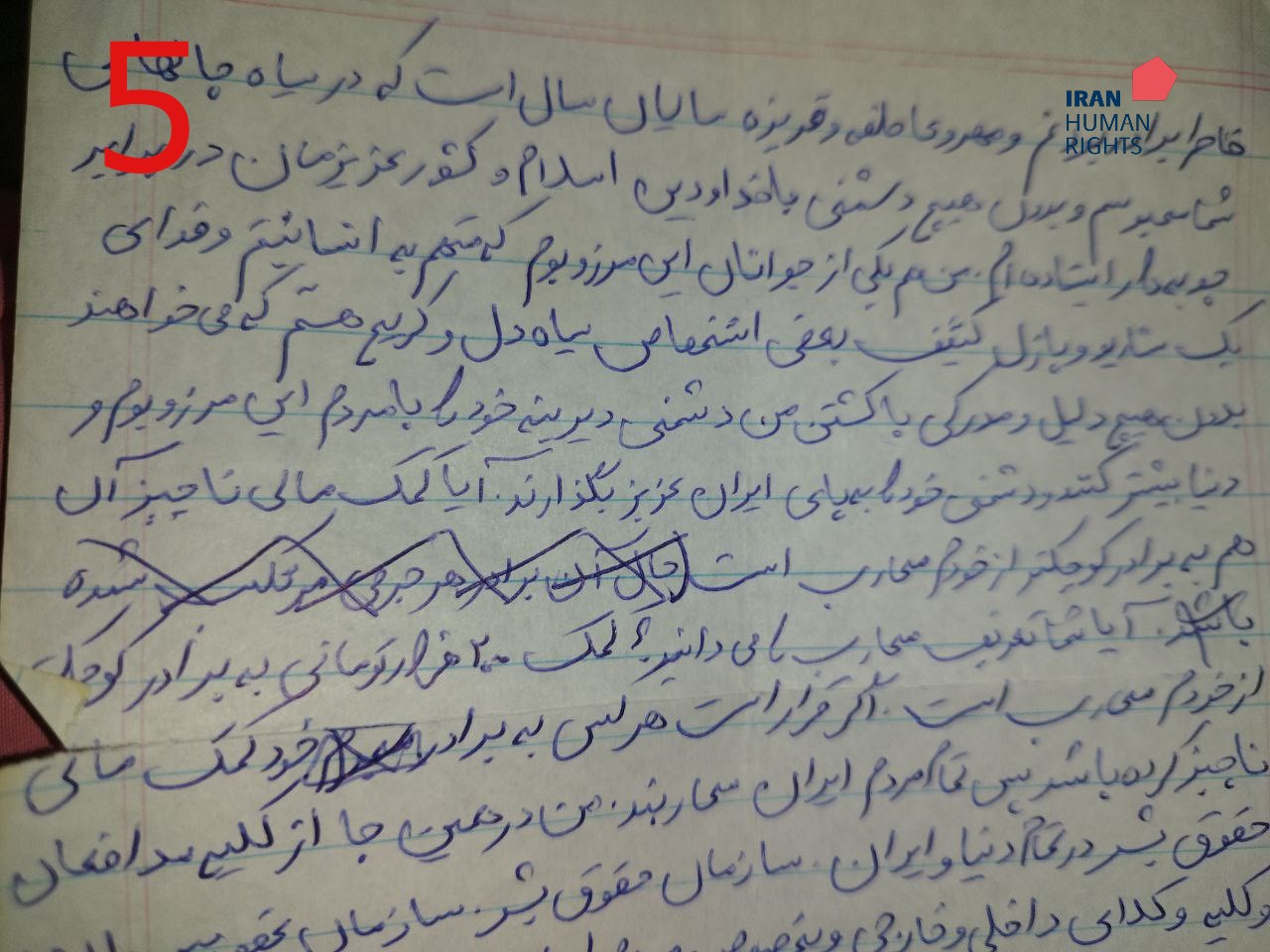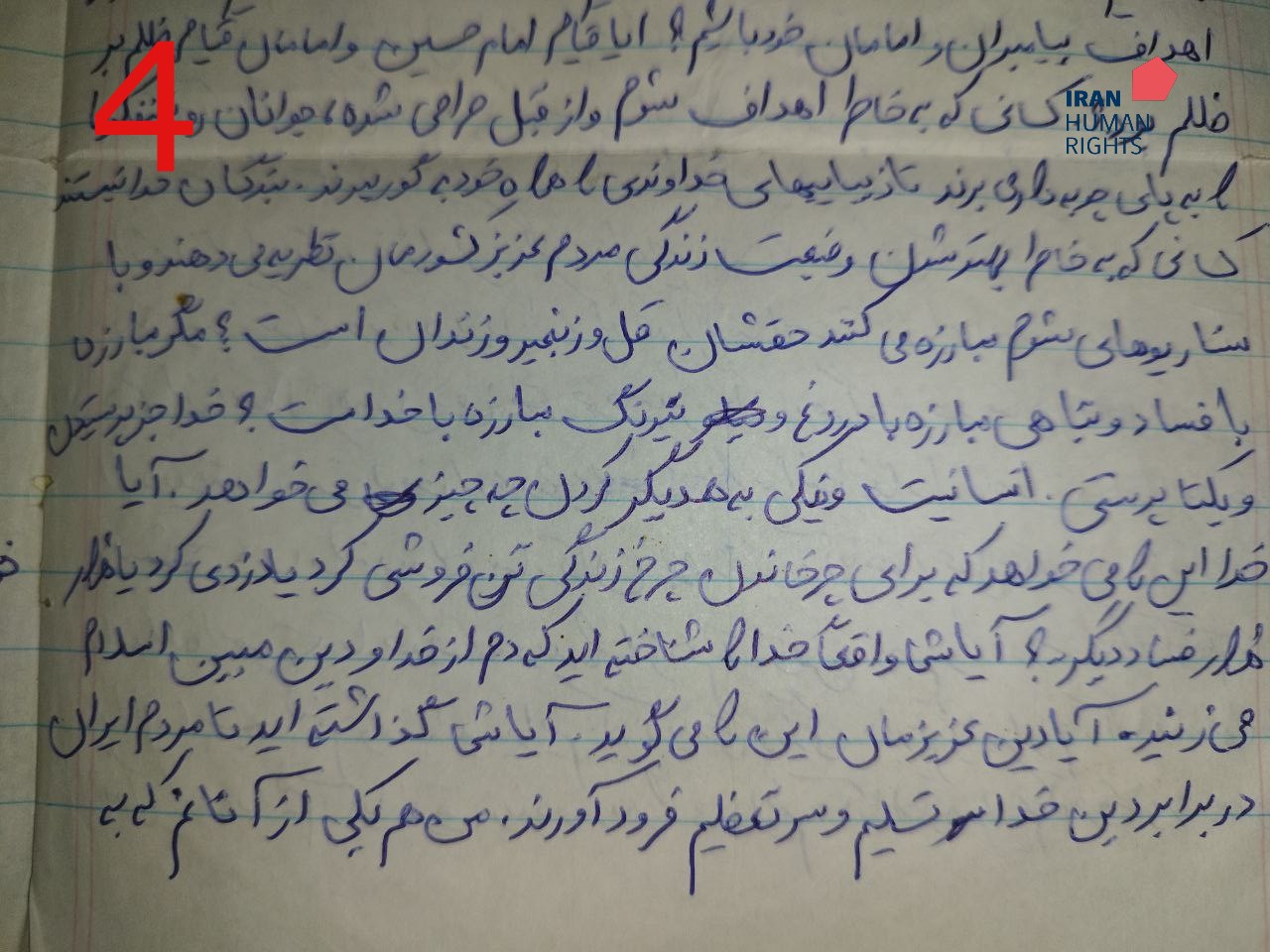 او در بخشی از نامه خود که در سال ۱۳۸۹ در زندان رجایی شهر کرج و چند هفته پیش از اعدامش نگاشته، آورده بود: «کسانی که بخاطر اهداف شوم و از قبل طراحی شده، جوانان روشنفکر ما را بهپای چوبهدار میبرند تا زیباییهای خداوندی را در راه خود بهگور ببرند، بندگان خدا نیستند. کسانی که بهخاطر بهتر شدن زندگی مردم عزیز کشورمان نظریه میدهند و با سناریوهای شوم مبارزه میکنند، حقشان غل و زنجیر و زندان است؟»